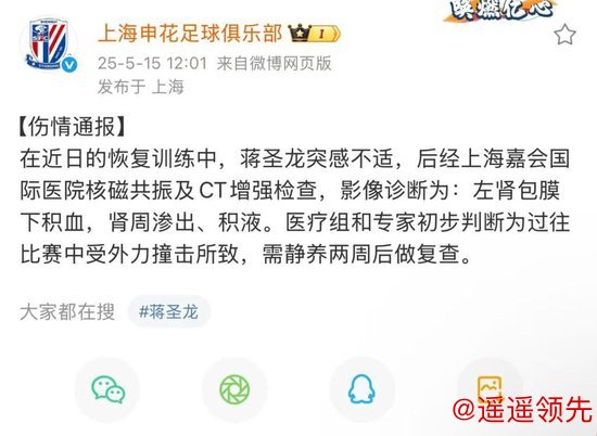 申花官方通告称:在近日的恢复训练中,蒋圣龙突感不适,后经上海嘉会国际医院核磁共振及CT增强检查,影像诊断为:左肾包膜下积血,肾周渗出、积液。医疗组和专家初步判断为过往比赛中受外力撞击所致,需静养两周后做复查。
